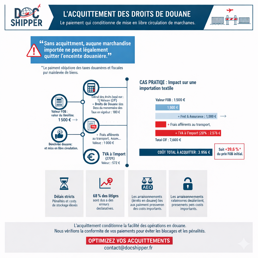 Ce montant de 3 956 € représente 39,56% de la valeur FOB initiale. L’acquittement doit intervenir dans les 10 jours suivant l’enregistrement de la déclaration. Tout retard génère des intérêts de 0,4% par mois de retard.