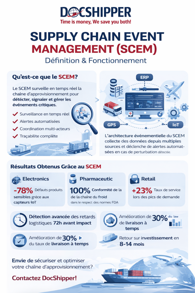 Chez DocShipper, nous configurons des règles SCEM personnalisées pour chaque client, notamment pour surveiller les délais de dédouanement critiques ou les fenêtres de livraison contractuelles. Cette approche permet d’éviter 95% des retards évitables selon nos statistiques internes.