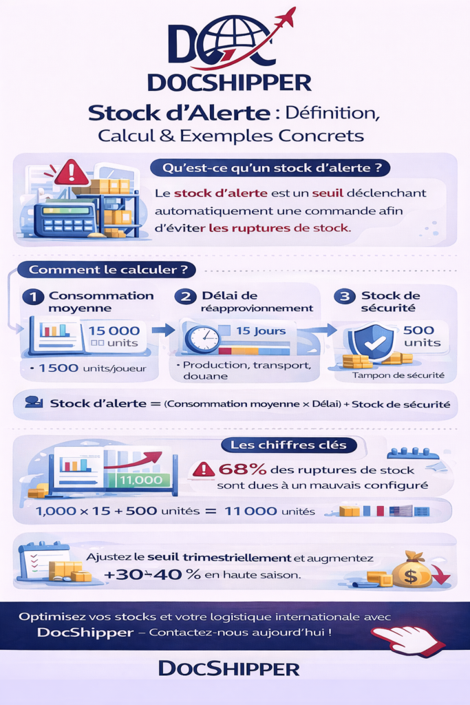 Dans le contexte réglementaire international, certains produits soumis à contrôles sanitaires ou phytosanitaires nécessitent des stocks d’alerte majorés. Les services douaniers français recommandent d’intégrer une marge de 15 à 20% pour les marchandises à inspection systématique. Chez DocShipper, nous intégrons ces contraintes réglementaires dès la phase de planification logistique pour éviter toute immobilisation imprévue.