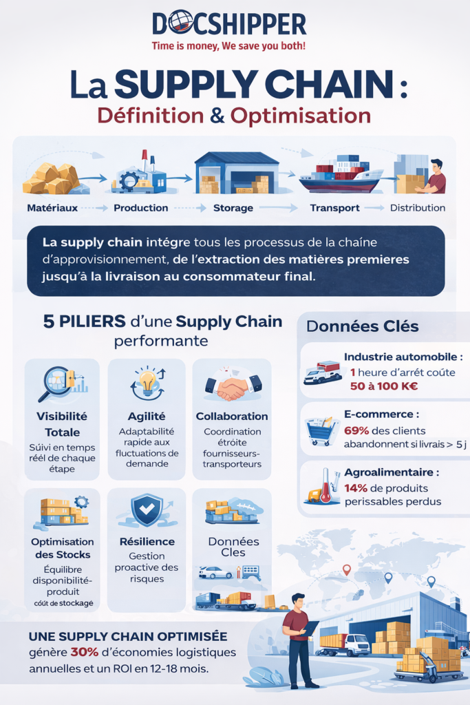 La supply chain (chaîne d'approvisionnement) désigne l'ensemble des processus interconnectés permettant l'acheminement d'un produit depuis l'extraction des matières premières jusqu'à sa livraison au consommateur final. Elle intègre la planification, l'approvisionnement, la fabrication, le stockage, le transport et la distribution, orchestrant ainsi tous les flux physiques, informationnels et financiers nécessaires à la création de valeur.