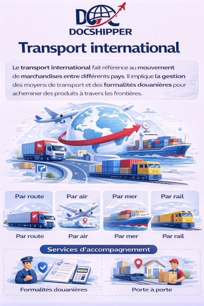 Le transport international désigne le déplacement physique de marchandises ou de personnes entre deux ou plusieurs pays, utilisant des modes terrestres, maritimes ou aériens. Régi par des conventions internationales comme les Incoterms ou la Convention de Montréal, il constitue l'épine dorsale du commerce mondial et nécessite une coordination logistique complexe entre transporteurs, douanes et acteurs réglementaires.